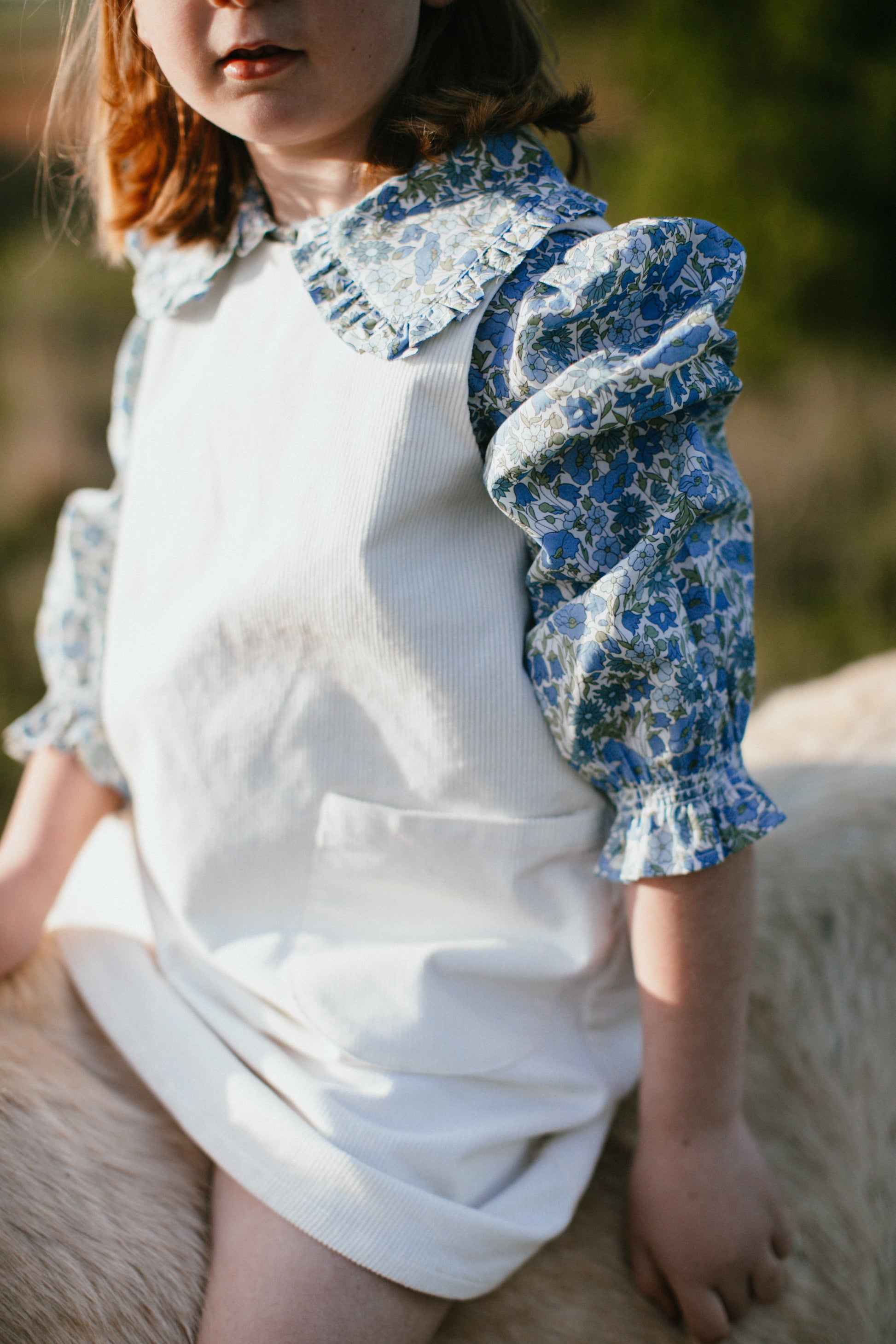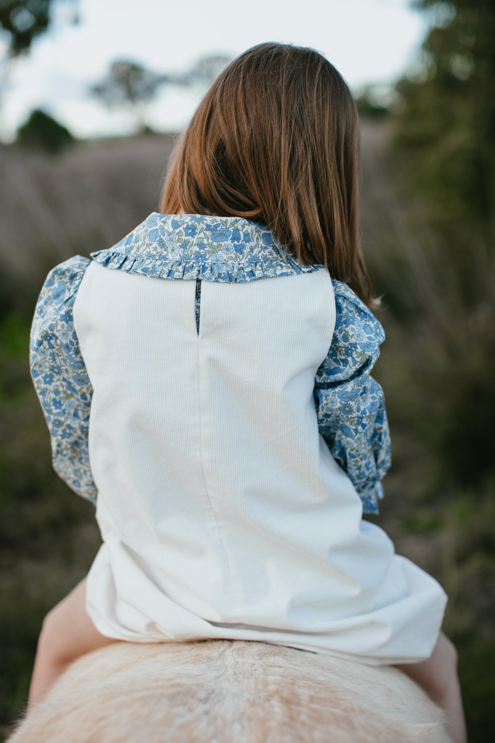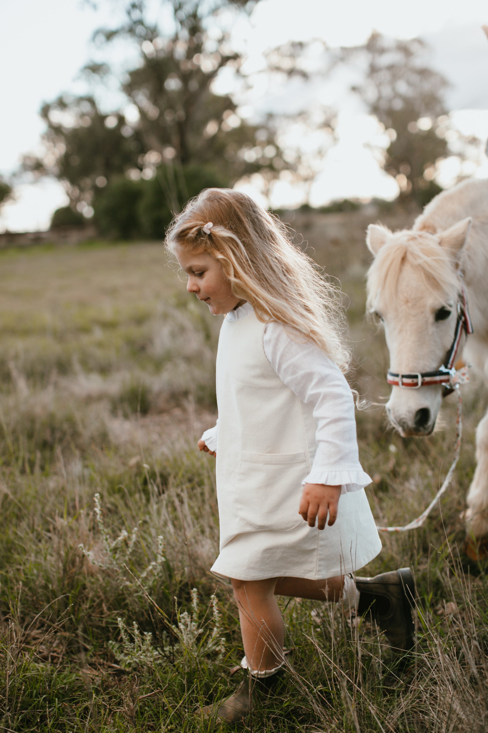 Our dreamy Lovey Pinafore in a deliciously soft , milk coloured baby corduroy might just be the most romantic and versatile piece you will own. A nod to the nostalgia of childhood from a bygone era with its sweet vintage vibe.