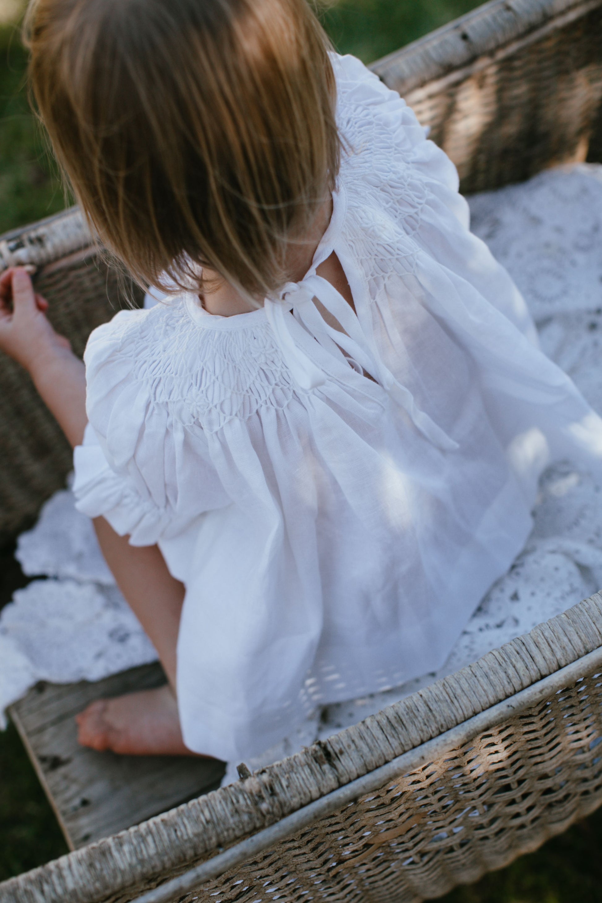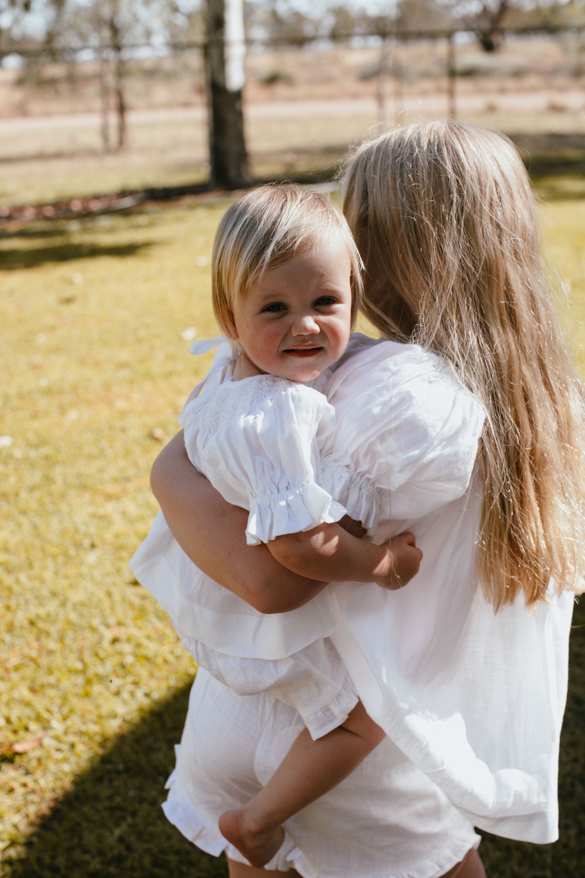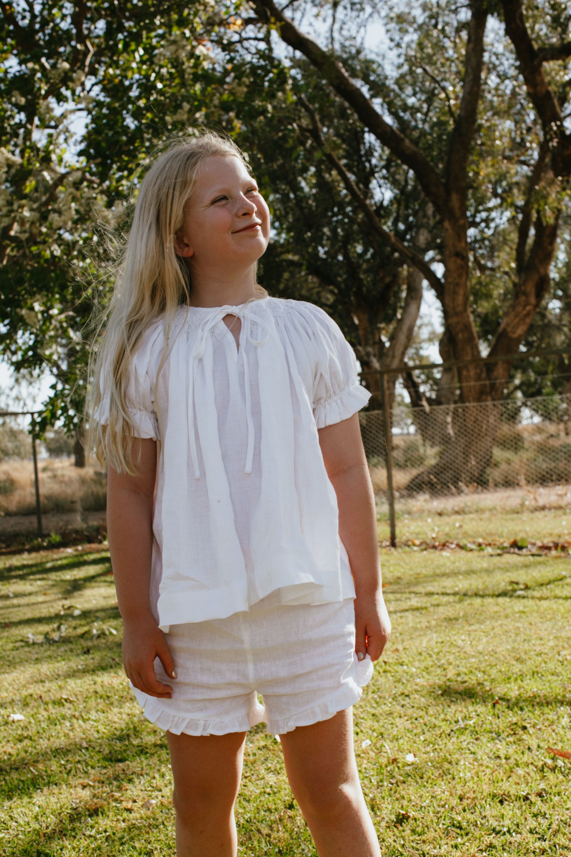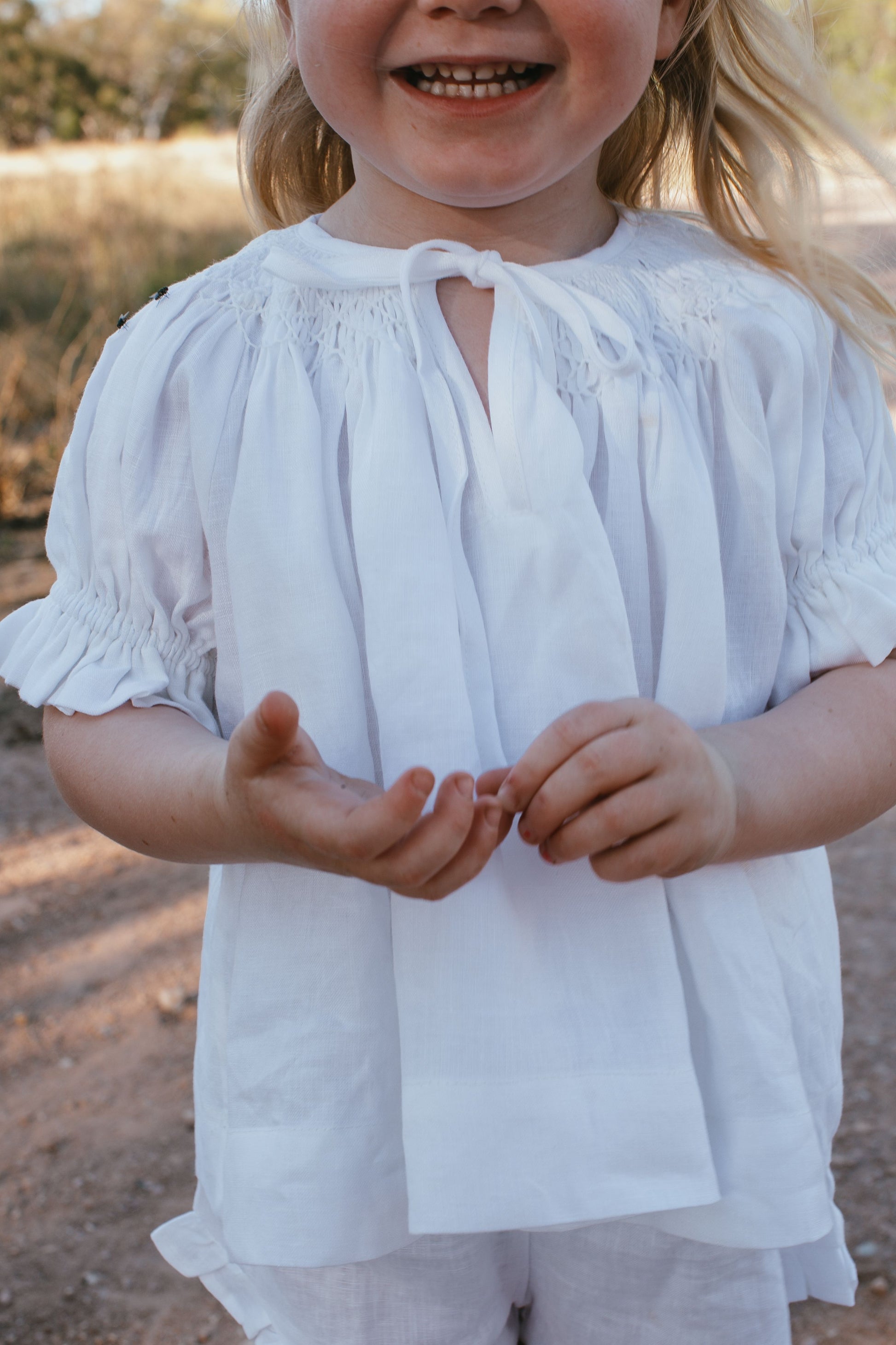 With, Kennedy signature hand smocking detail, the blouse has gentle puff sleeves and a floaty bodice and neck tie. No buttons, no fiddly bits. This blouse can be worn with both full smocking detail at the front, or reverse with the sweet necktie facing front ways. Pairing with a simple ruffle short with elastic waist band for comfort.