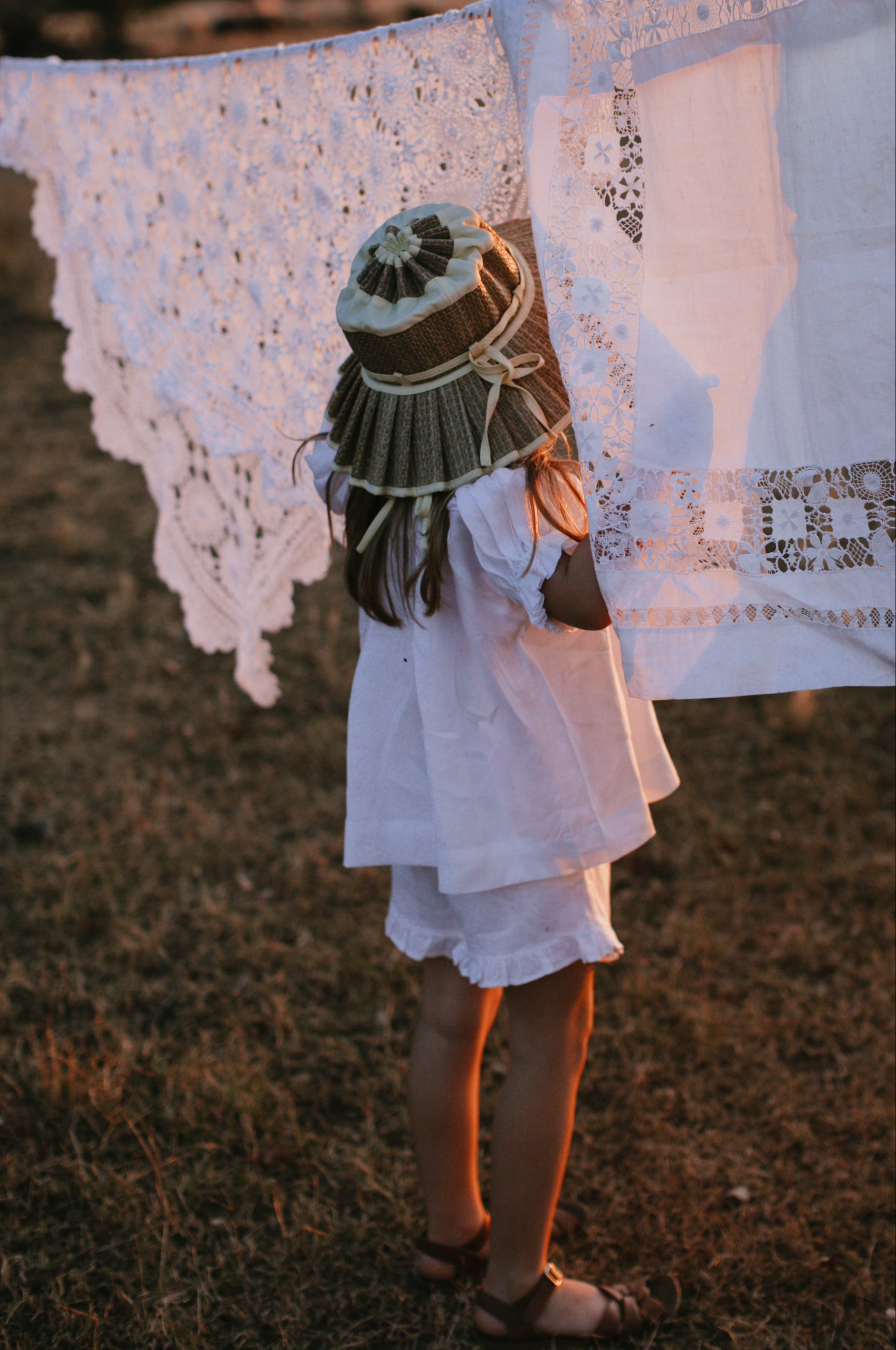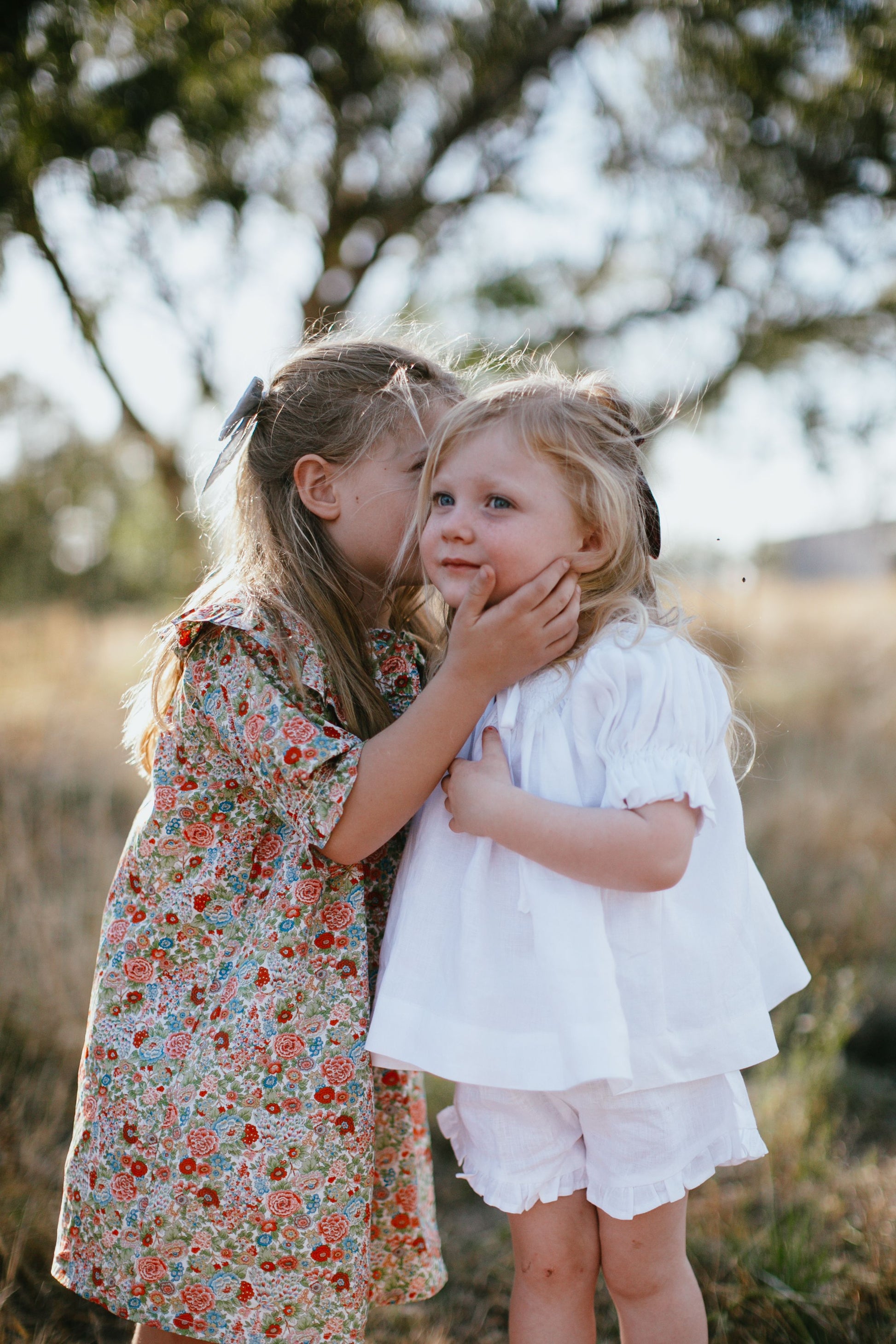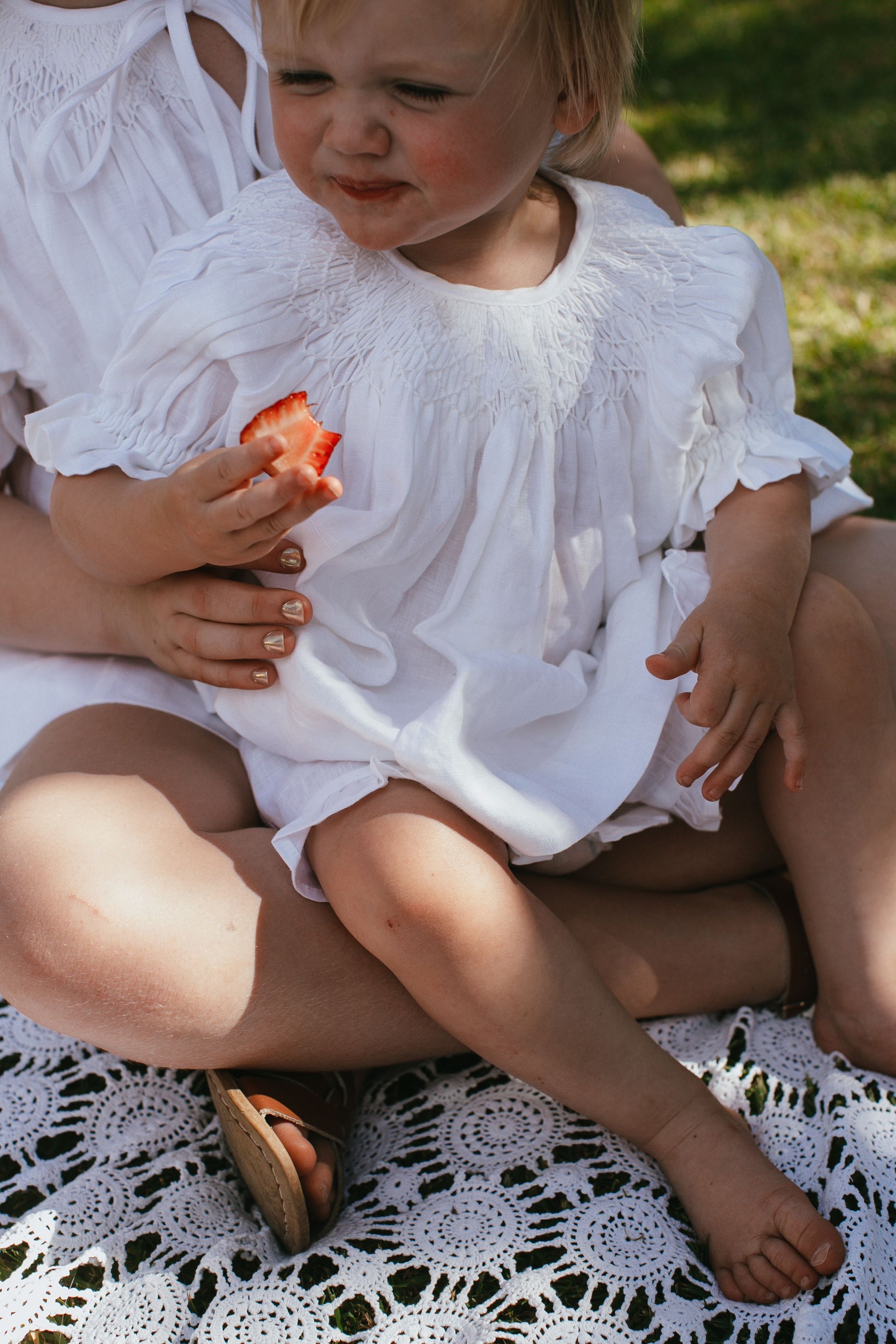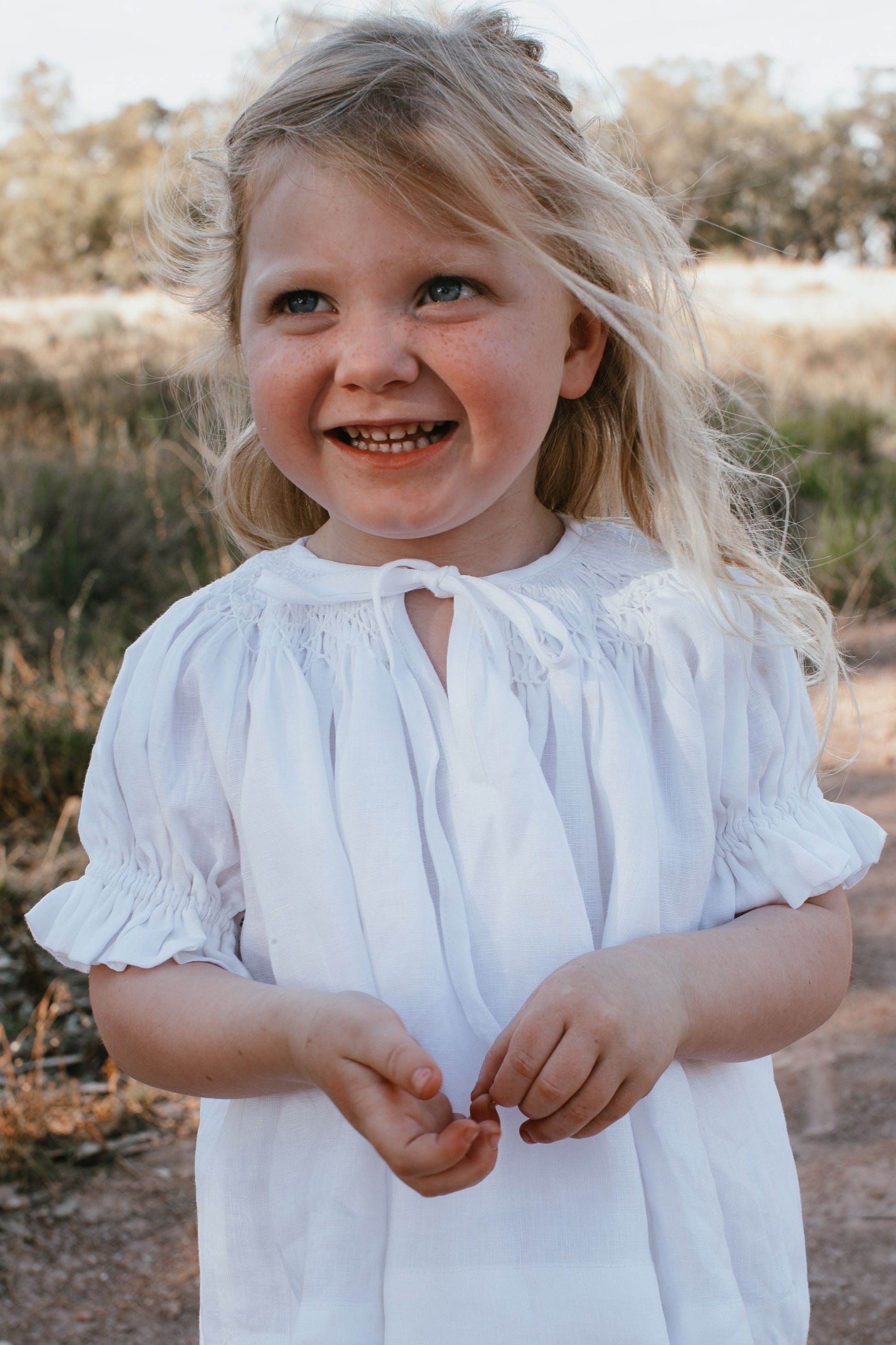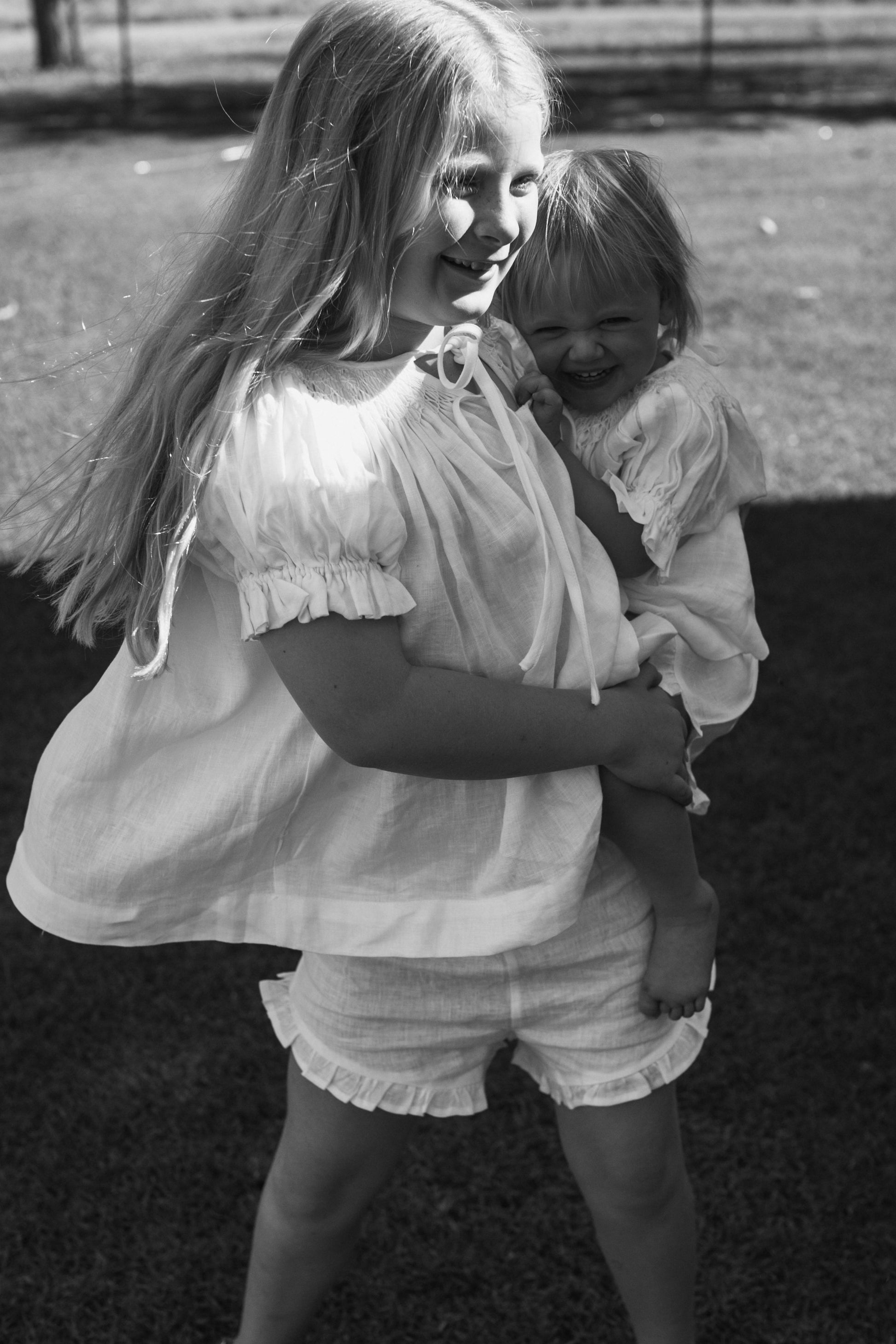 With, Kennedy signature hand smocking detail, the blouse has gentle puff sleeves and a floaty bodice and neck tie. No buttons, no fiddly bits. This blouse can be worn with both full smocking detail at the front, or reverse with the sweet necktie facing front ways. Pairing with a simple ruffle short with elastic waist band for comfort.