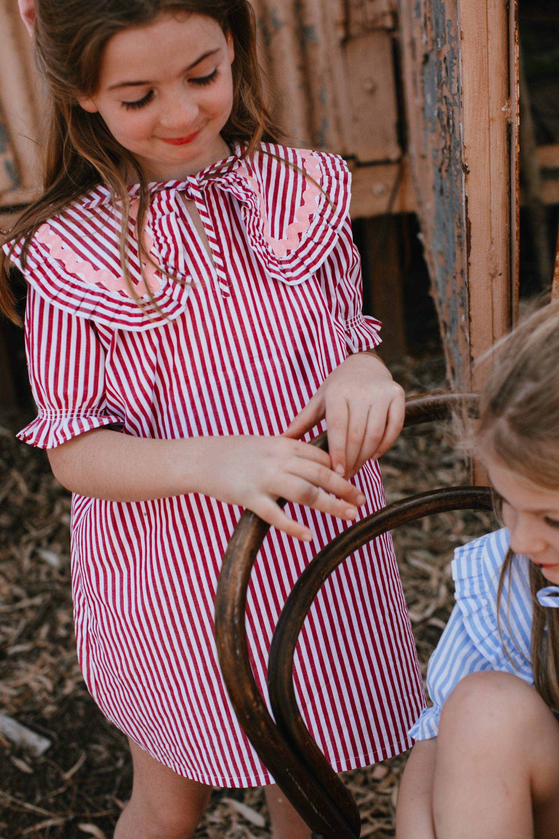 The iconic Wonderland Dress. Short, sweet and oh so easy to wear. A vintage wash red stripe with pink Ric Ric detail. Classic and fun. Perfect for any Summer celebration!